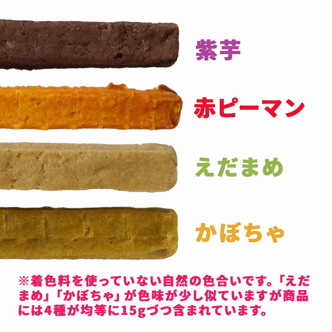 ※着色料を使っていない自然の色合いです。「えだまめ」「かぼちゃ」が色味が少し似ていますが商品には4種が均等に15gづつ含まれています。